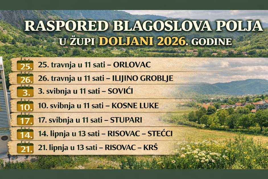 Župnik župe Doljani fra Marko Cvitković objavio je raspored blagoslova polja za 2026. godinu. Ova dugogodišnja tradicija okuplja vjernike na molitvu za blagoslov zemlje, plodova rada i zaštitu od nepogoda.